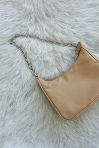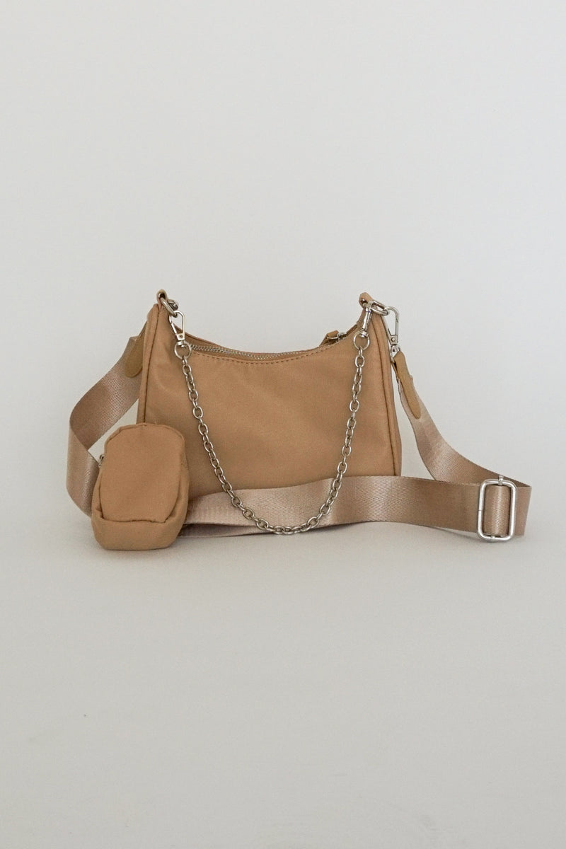 The Lorissa Nylon Purse in Beige is the perfect purse to elevate any look! With its multi-wear capabilities, this purse is perfect for any occasion! The purse could be carried with its silver chain as a shoulder purse, or as a crossbody bag with its removable nylon strap! Available in the color Beige