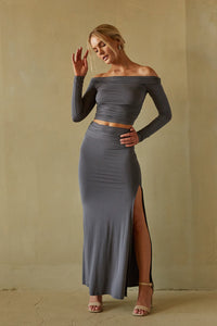 Elevate your wardrobe with the Carrington Long Sleeve Top! This chic top features a boat neckline and ruching on the sides. Pair with the matching Carrington Maxi Skirt to complete the look!