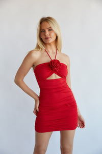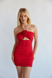 Add a touch of romance to your night out with the Madalyn Rosette Cutout Halter Bodycon Mini Dress! This stunning bodycon dress features an adjustable cinch halter neck tie with a rosette detail at the bust, a cutout, and ruching down the sides and spine. Available in red and mauve. Pair with a simple heel to complete the look!