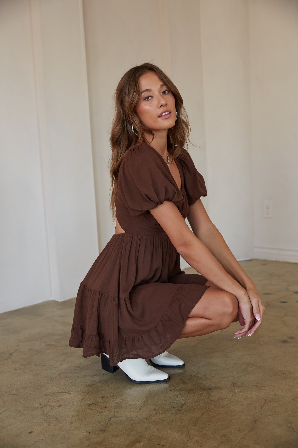 Ready for sunshine in the Dallas Open Back Puff Sleeve Babydoll Mini Dress! This puff sleeve dress features an adjustable lace up back, adjustable keyhole front, and an open back. Available in black, yellow, brown, and sienna.