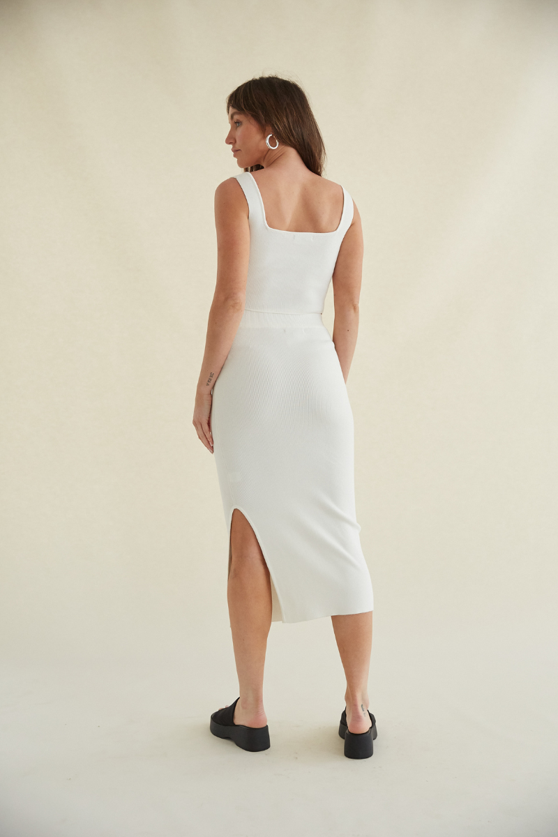 Get ready for warm summer days in the Jacqueline High-Rise Knit Midi Skirt! This ribbed skirt is complete with a flattering thick waistband and left side slit. Available in cream and blue. Pair with the Jacqueline Cropped Knit Tank Top to complete the set