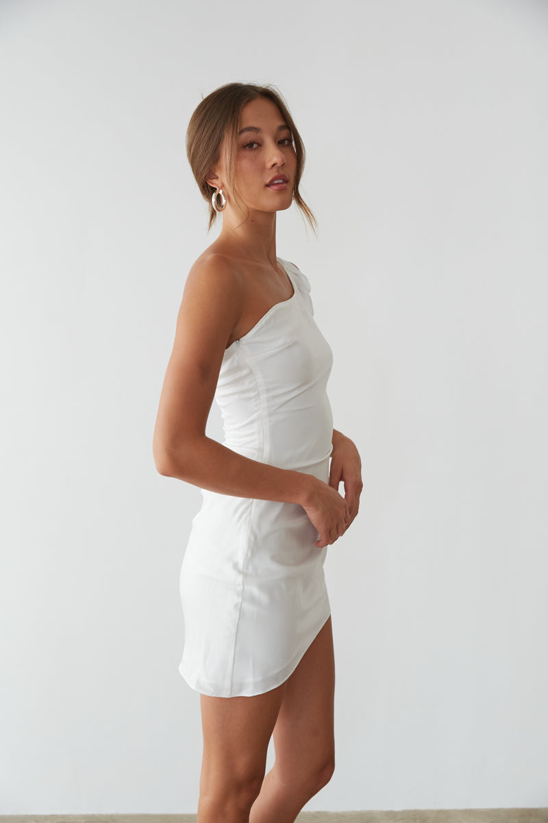 Slip into the Sonia Draped One Shoulder Asymmetrical Mini Dress for the perfect party look! This stylish mini dress is complete with an asymmetrical hem and one shoulder strap with a draped fabric detail. Available in black and white. Finish off the look with your favorite accessories!