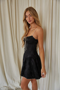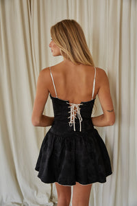 Trendy and timeless, the Alisha Coquette Contrast Fit and Flare Mini Dress is the perfect little black dress! This jacquard dress features a fit and flare silhouette , lace up back, and coquette bow details! Available in Black + White Contrast; style with a chic pair of heels to complete the look!