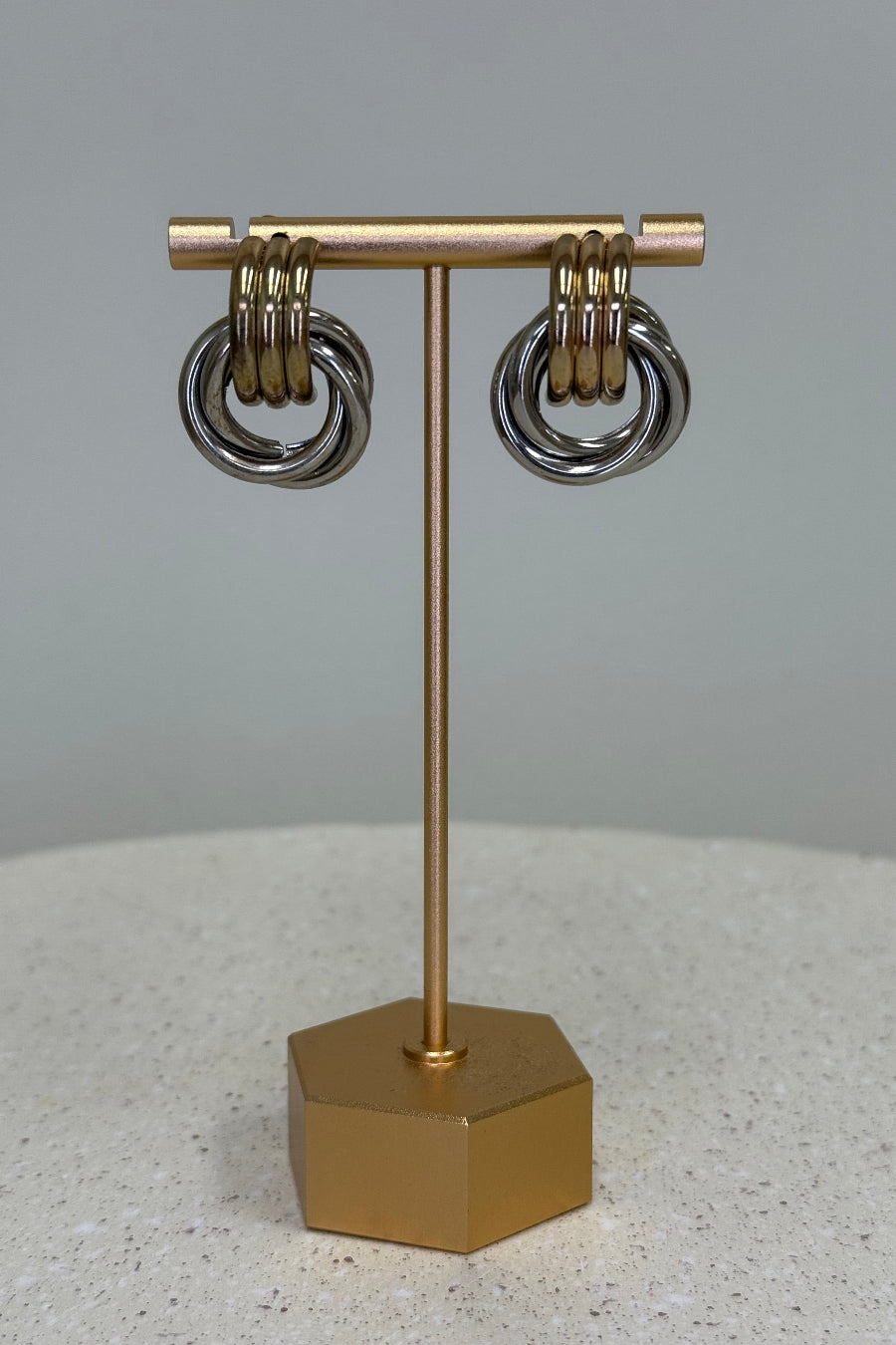 Elevate any look with the Sharon Two-Toned Earrings, a chic statement accessory designed to shine from every angle. Featuring an interlocked design with a polished gold top and sleek silver hoops, these mixed-metal earrings deliver the perfect balance of modern edge and timeless style. Lightweight yet eye-catching, they add instant polish whether you’re dressing up for a night out or elevating an everyday outfit.