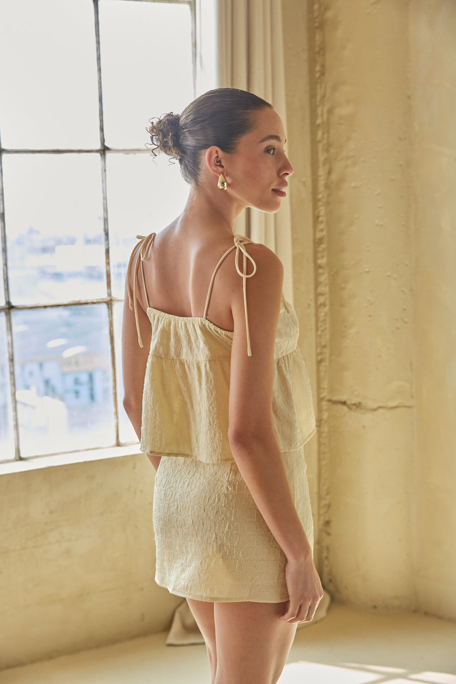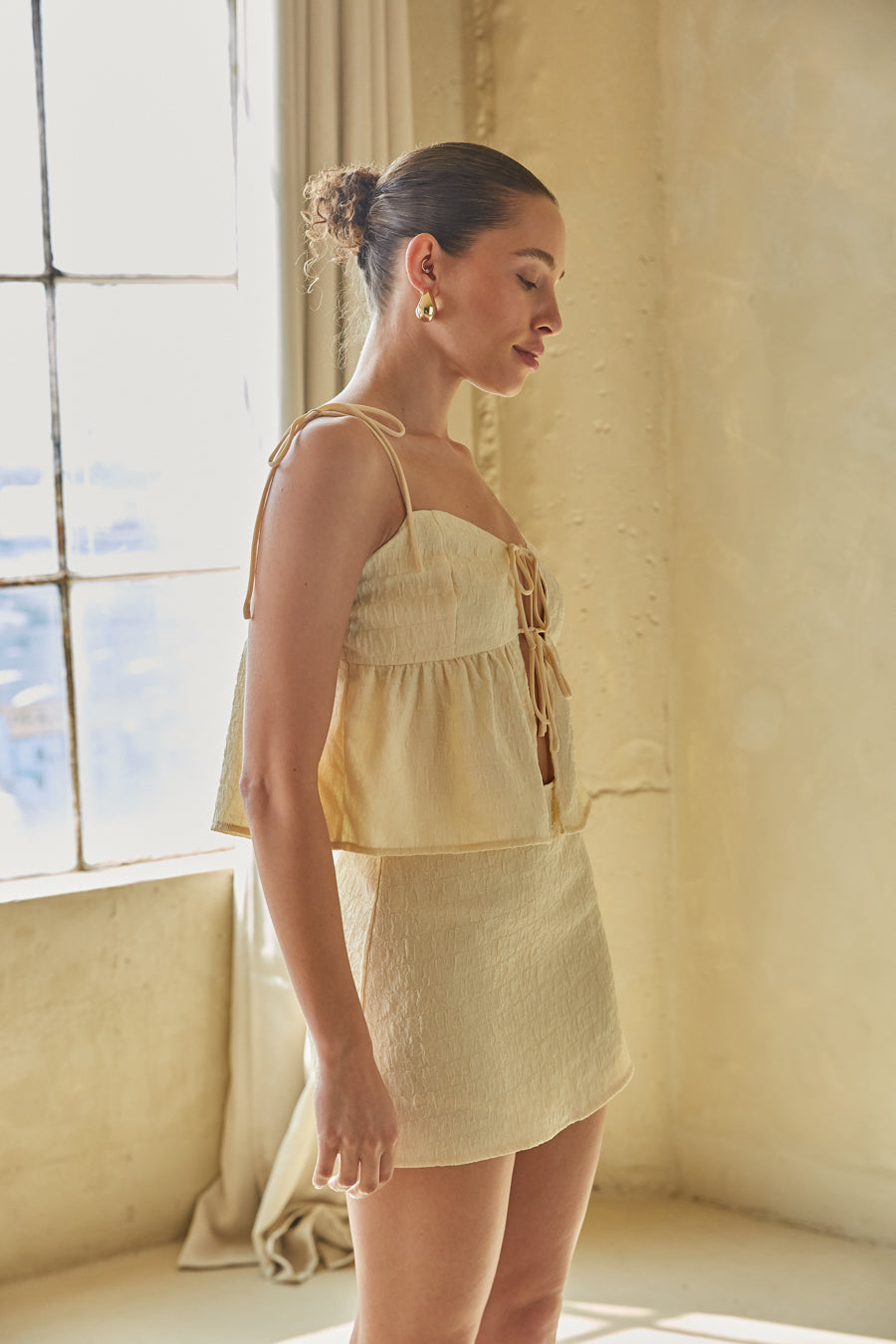 You'll look simply radiant in the Talia Textured Mini Skirt! This skirt is made of a crinkle texture material and features a high rise fit and mini length. Pair with the matching Talia Textured Tie Front Top to complete the set!