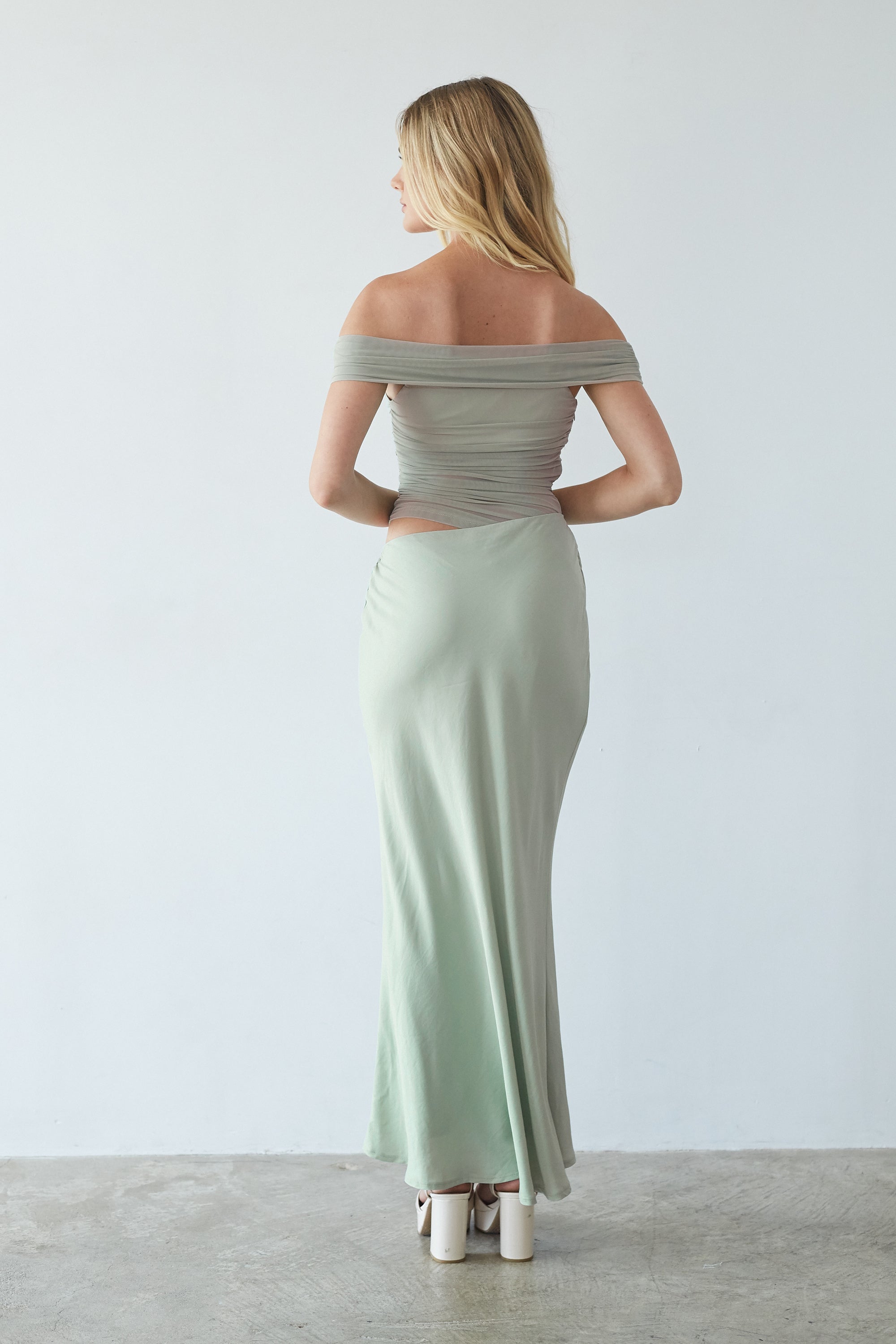 - Off the shoulder mesh maxi dress