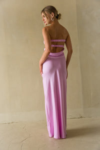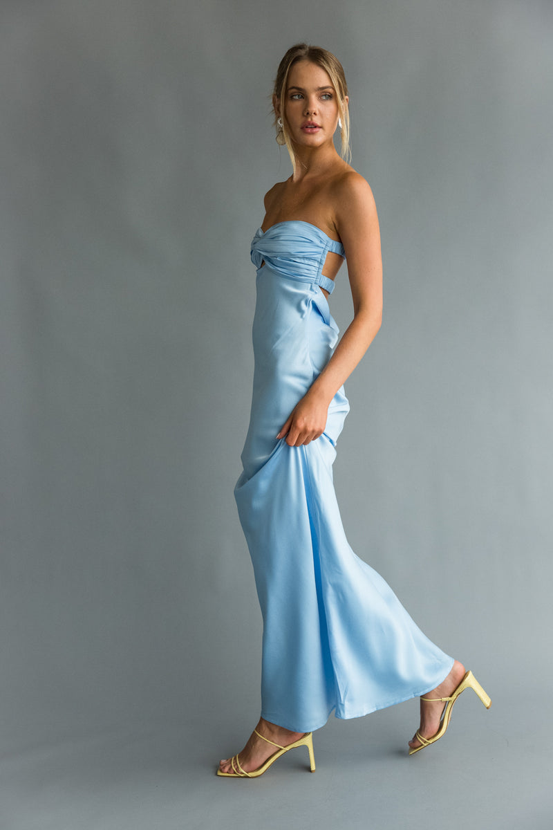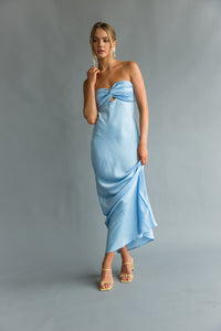 A step above your favorite mini dress, the Kira Keyhole Cutout Open Back Maxi Dress is Kiara's older sister! This strapless maxi dress features a twist front pleated bust, keyhole cutout, open cowl back, and floor length slinky silhouette. Available in orchid pink and sky blue! Pair with a chic pair of heels to complete the look!