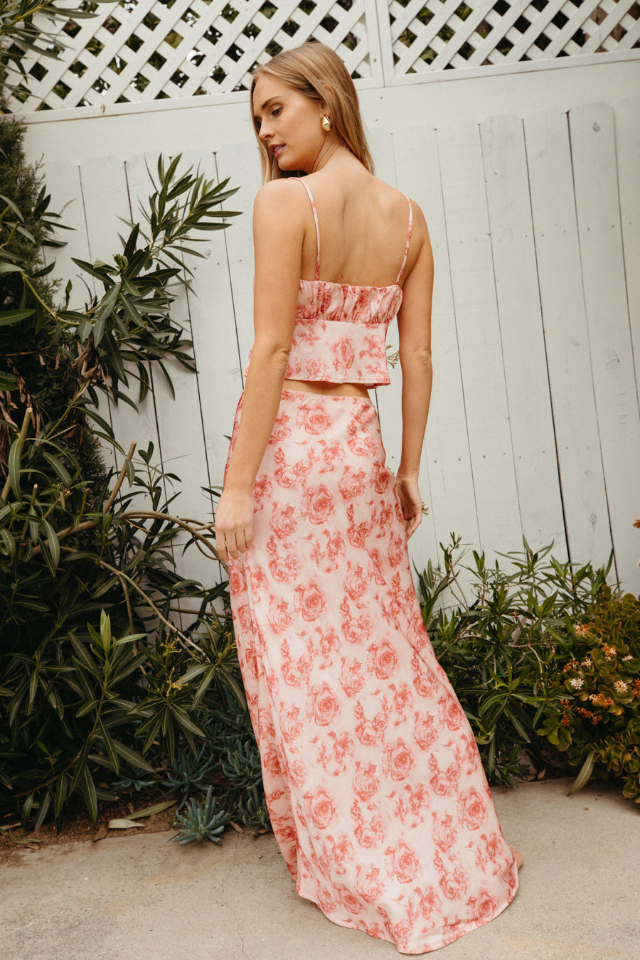 Charm them in the Rosetta Floral Satin Maxi Skirt! This beautiful skirt is made of a satin material and features a maxi length and drawstring waist with an eyelet lace trim. Pair with the matching Rosetta Ruched Floral Satin Top to complete the look!