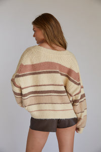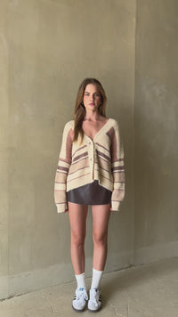 Snuggle up in the all new Alden Stripe Knit Button Up Cardigan! This sweater features a soft, plush knit fabrication, slouchy fit, and unique striped pattern. Available in Neutral Multi; style with your favorite leather to complete the look!