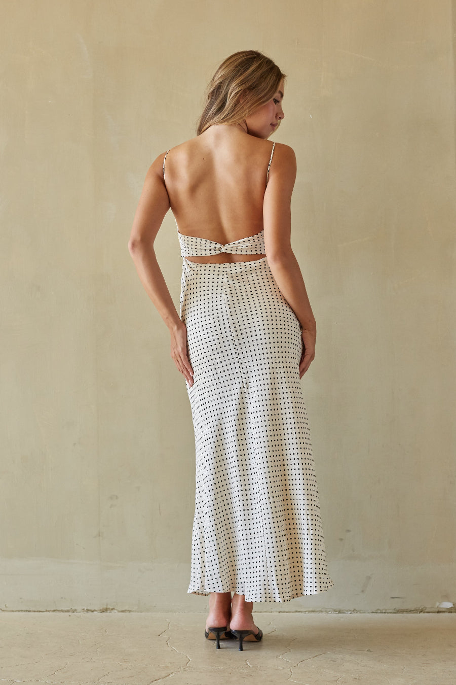 Light up the room in the updated Candie Polka Dot Satin Maxi Dress — now with playful polka dots. Crafted from luxe satin, it features a ruched bust, adjustable spaghetti straps, and an open back with a twist strap detail. Just add your favorite accessories to complete the look.