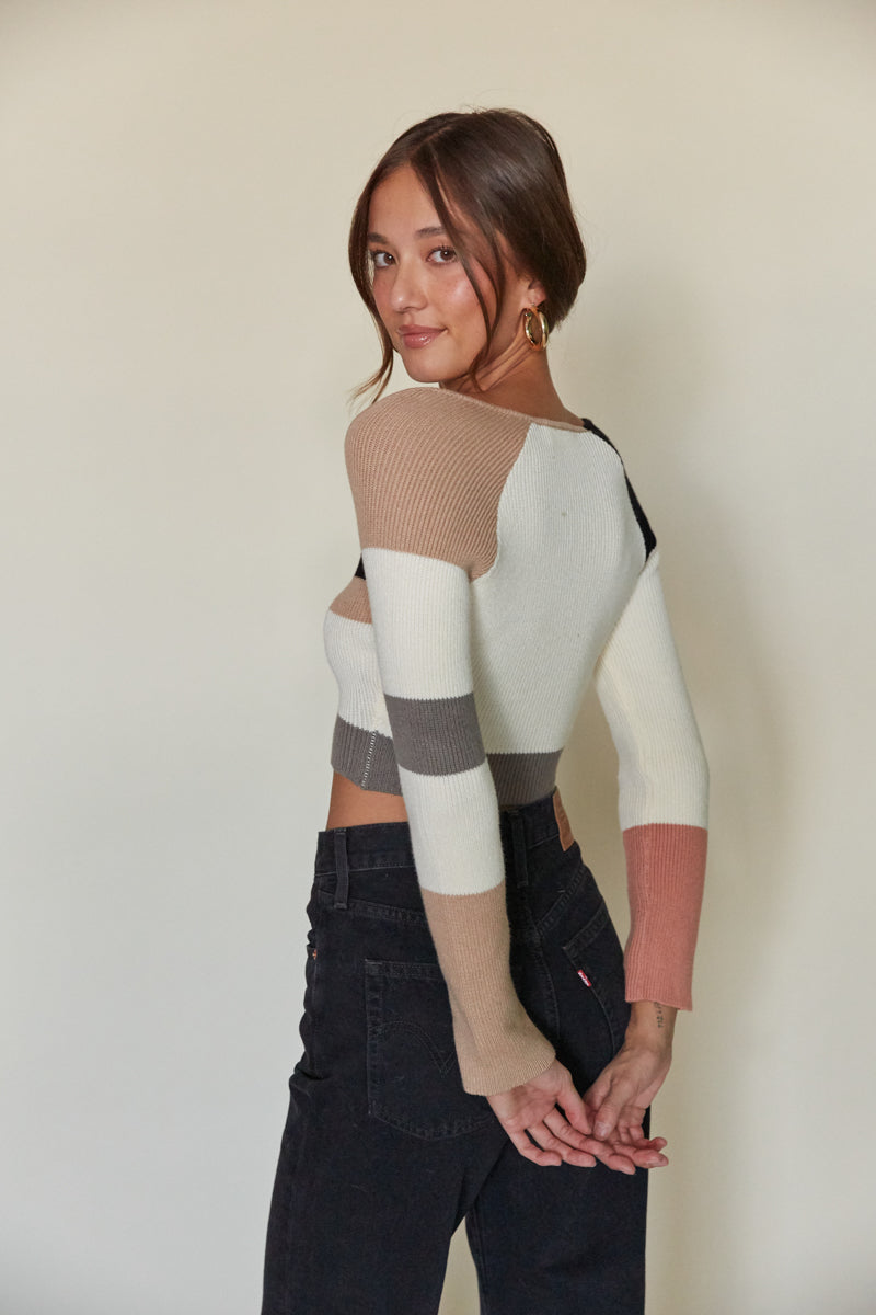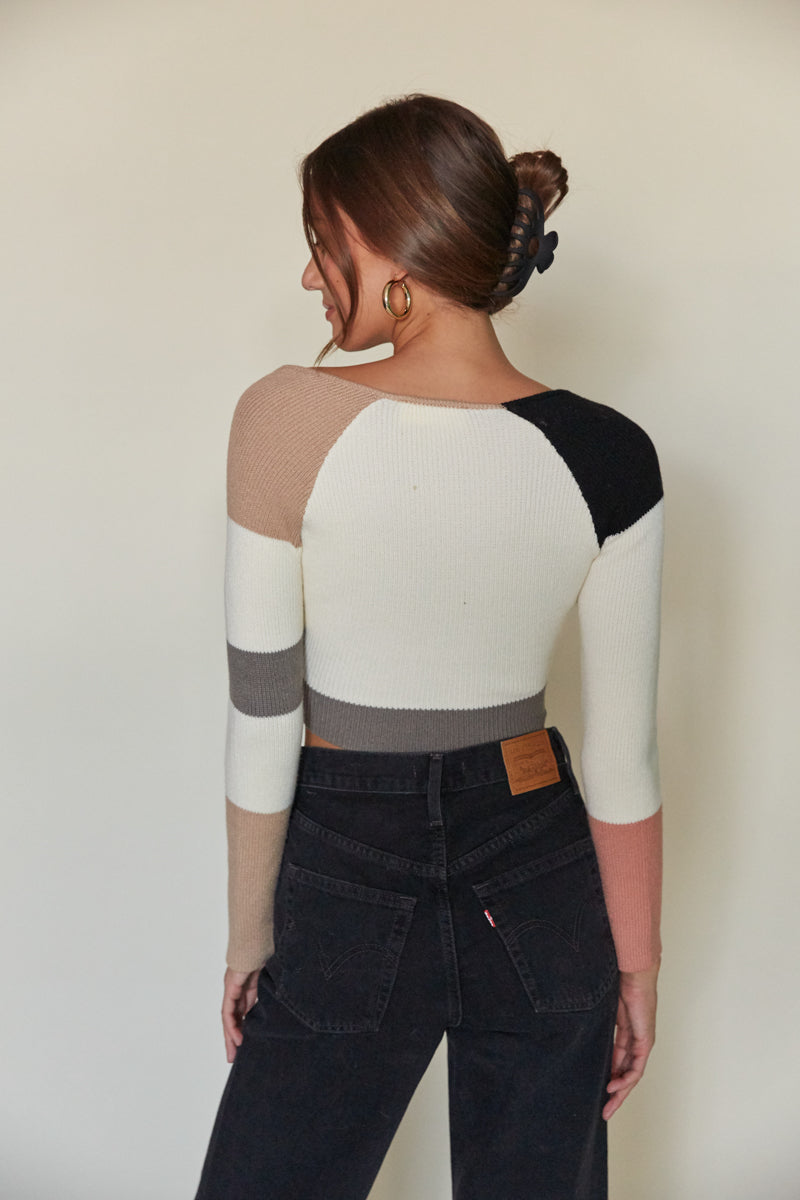 The Carina Long Sleeve Colorblock Sweater is a seasonal favorite! This trendy knit top features a colorblock design, square neckline, long sleeves, and a cropped hem. Pair with the Levi's Ribcage Wide Leg Jeans in Rosie Posie to complete the look!