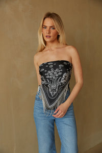 Grab your boots and get ready to rock the Dolly Rhinestone Fringe Bandana Top! This fun satin bandana features a paisley print, rhinestone fringe, and V-hem. Wear it as a top or scarf. Available in black and nude.