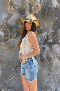 Coastal cowgirl with an edge is how we'd describe the Ellie Pointelle Open Knit Tank Top! This trendy top is complete with a distressed style open knit design, crew neckline, and a raw hem. Pair with some western boots to complete the look!