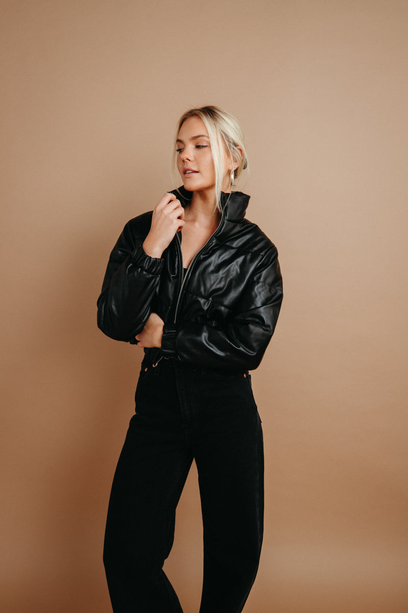 The Ellis Faux Leather Puffer Jacket is a cold weather essential! This trendy jacket features a high neck collar, cropped fit, elastic waistband, and a front zipper. Available in black and ivory.