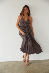 Keep it simple in the Ester Tiered Linen Midi Dress this Fall season! This trendy midi dress features a sexy open back, tiered flowy skirt, and two functional side pockets! Available in Java Brown; style with a chic pair of heels to polish off the look!