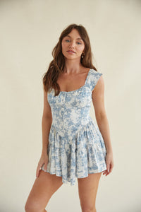 Sweeten up your style with the Kaylyn Bustier Button Romper! This adorable romper features a button front closure, ruffle hem, and sewn bustier design. Available in blue toile and white. Pair with a chic sandal to complete the look!