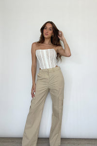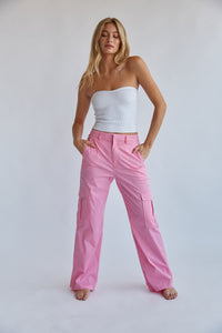 Serve off-duty model looks in the Keely Wide Leg Cargo Pants! These trendy pants feature a straight leg, high-waisted fit, double front and back pockets, belt loops, and two side utility pockets. Available in pink, black, and tan. Pair with a cute corset to complete this trendy look!