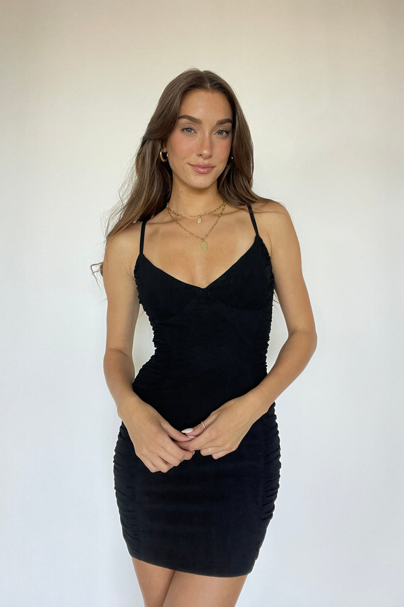 Looking so cute in the Kloss Ruched Mesh Mini Dress! Featuring a bodycon silhouette, sweetheart neckline, adjustable spaghetti straps, and a ruched mesh overlay! Also available in black. Complete this look with the Milla Croc Boots.