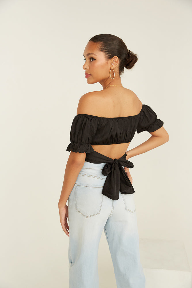 Lookin' cute in the Mara Puff Crop Top! Featuring a sweetheart neckline with a ruched bust, short puff sleeves with a ruffle trim, and a wrap waist tie for a flirty final touch. Available in pink and black.