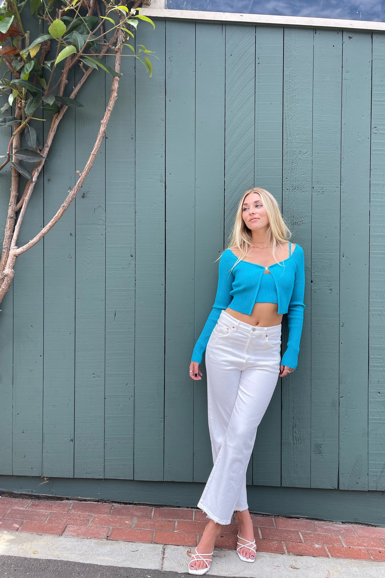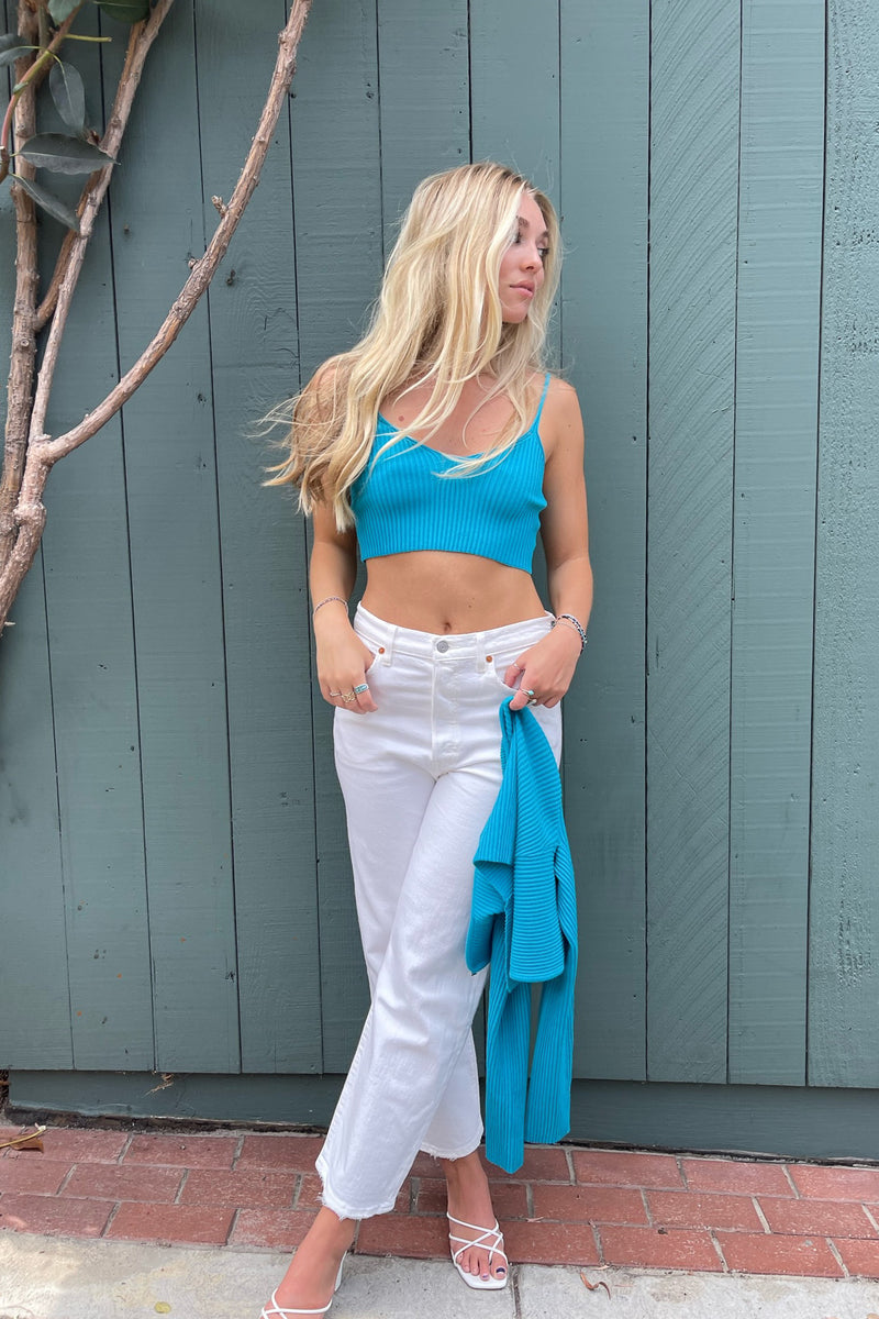 The Marina Ribbed Cami Crop Top features a soft ribbed knit fabric and a V-neckline. Available in blue. Wear this top with the matching Marina Single Clasp Ribbed Cardigan for the perfect fall look!