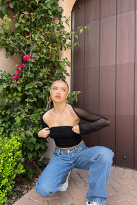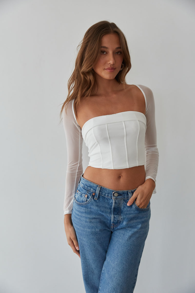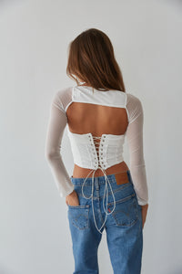 So trendy in the Rio Corset Shrug Set! This corset top is complete with a strapless fold over neckline, a lace up back with silver grommets, and a mesh long sleeve shrug. Available in black and white. Pair with your favorite jeans to complete the look!